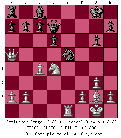 Last move : 1-0 2020 May 7 8:43:29 [Event "FICGS__CHESS__RAPID_E__000236"] [Site "FICGS"] [Date "2020.02.20"] [Round "1"] [White "Zemlyanov,Sergey"] [Black "Marcel,Alexis"] [Result "1-0"] [WhiteElo "1250"] [BlackElo "1213"] 1.d4 f5 2.g3 Nf6 3.Bg2 g6 4.Nf3 Bg7 5.O-O O-O 6.c4 d6 7.Nc3 Re8 8.Re1 Nbd7 9.e4 fxe4 10.Nxe4 e5 11.Nxf6+ Bxf6 12.Be3 exd4 13.Bxd4 Rxe1+ 14.Qxe1 Bxd4 15.Nxd4 Ne5 16.Qa5 Qd7 17.Re1 1-0 This chess game has been lost on time (started : 2020.02.20 20:37:50) Dutch defense Kingside Castling by player White (move 5) Kingside Castling by player Black (move 5) Player White won this chess game. Follow this game move after move (download)There just isn't enough televised Chess. (David Letterman) Drei Punkte vor allen anderen ist wie einer, der im weißen Anzug posiert, während der Rest in Müllsäcke gekleidet dasteht. (Viktor Kortschnoi) En un gambito tu regalas un Peón por el bién de tomar un juego perdido. (Samuel Standige Boden) Les écrivains ont utilisé les échecs pour analyser les côtés extrêmes de la nature humaine. Dans ce cadre, les échecs offrent un champ d'expérimentation idéal. Mais on pourrait faire la même chose avec la peinture. Et là, en vous référant à Van Gogh, vous ne tirerez pas de conclusion définitive sur les peintres. (Gary Kasparov) I couldn't make any sense out of what this particular thread is about. It sounds like R2 D2 computer speaking. A space fight ?!? Some 'command' problems in Moscow ? Some killers & narcotic addicts attacking some game & a god wannabe ?? (Dinesh De Silva, lost in a russian conflict in FICGS forum)