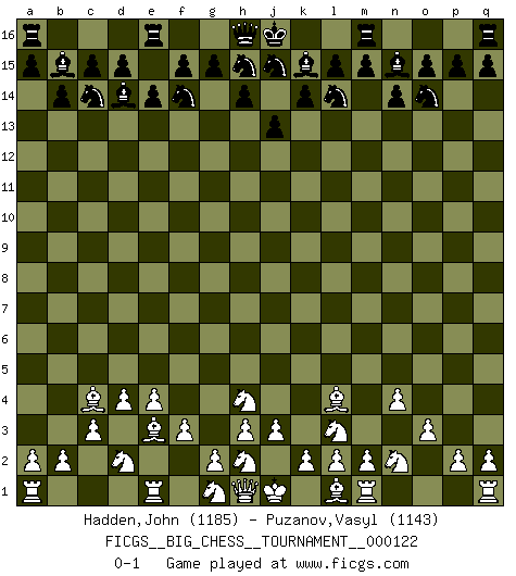 Last move : 0-1 2020 May 15 12:11:25 [Event "FICGS__BIG_CHESS__TOURNAMENT__000122"] [Site "FICGS"] [Date "2020.02.20"] [Round "1"] [White "Hadden,John"] [Black "Puzanov,Vasyl"] [Result "0-1"] [WhiteElo "1185"] [BlackElo "1143"] 1.c2-c3 p16-o14 2.o2-o3 b15-b14 3.d2-d4 n15-n14 4.f2-f3 c16-b15 5.k1-l3 k16-l14 6.e2-e4 k15-k14 7.n2-n4 b16-c14 8.o1-l4 o16-n15 9.c1-e3 l16-k15 10.b1-d2 e15-e14 11.j2-h4 j14-j13 12.f1-c4 f16-d14 13.p1-n2 g16-f14 0-1 This big chess game has been lost on time (started : 2020.02.20 20:38:24) Follow this game move after move (download)The enormous mental resilience, without which no Chess player can exist, was so much taken up by Chess that he could never free his mind of this game. (Albert Einstein) Dieses schreckliche Gefühl, dass ich gegen eine Maschine spielte, die niemals Fehler macht, zerschmetterte meinen Widerstand. (Mark Taimanov) No solamente yo pronostico su triunfo sobre Botvinnik, sino que me adelanto y digo que probablemente Fischer es el jugador de Ajedrez mas grande que haya existido. (John Collins) Ne tendez aucun piège pour le plaisir ! Ne jouez rien dans l'espoir que l'adversaire réagisse de façon stupide ! Prenez toujours pour acquis que l'adversaire va trouver le meilleur coup ! Ne jouez jamais de coup dans l'espoir que l'adversaire ne voie pas la menace ! Chacun de vos coups doit améliorer la position d'une façon ou d'une autre. Programmer - an organism that turns coffee into software. (Anonymous)