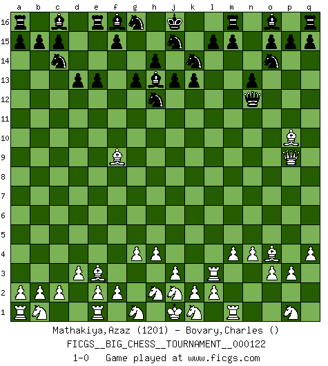 Last move : 1-0 2020 March 17 8:44:57 [Event "FICGS__BIG_CHESS__TOURNAMENT__000122"] [Site "FICGS"] [Date "2020.02.20"] [Round "1"] [White "Mathakiya,Azaz"] [Black "Bovary,Charles"] [Result "1-0"] [WhiteElo "1201"] [BlackElo ""] 1.q2-q4 g15-g13 2.q1-q3 d15-d13 3.q3-l3 k15-k13 4.g2-g4 h16-d12 5.m2-m4 n15-n13 6.d2-d3 j14-j13 7.n2-n4 d12-f12 8.c1-e3 k16-j14 9.h1-c6 b16-c14 10.p2-p3 h15-k14 11.l1-o4 f12-j12 12.o1-f9 j12-n12 13.o2-o3 e15-e13 14.h3-h4 j14-h12 15.c6-p6 l16-h13 16.p6-p9 p16-o14 17.f1-p10 1-0 Follow this game move after move (download)Kasparov : J'adoube , Ivanchuk : S'il vous plaît ! (Garry Kasparov & Vassily Ivanchuk, Linares 1997) Alle offensichtlichen Züge sehen nach dem Spiel in der Analyse verdächtig aus. (Viktor Kortschnoi) Los libros de Ajedrez deben de usarse igual como usamos los anteojos: para mejorar la vista, aunque algunos jugadores los quieren usar como si ellos les otorgaran la vision. (José Raúl Capablanca) Le temps de noter son nom sur la feuille de partie, j'étais déjà en zeitnot ! D'un modeste amateur apparié lors de la première ronde d'un open contre le grand-maître Azmaïparashvili. Mandala - that's it! 16x16 squares as multiple of the four and the eight because of the Four Noble Truths and the Noble Eightfold Path. (Heinz-Georg Lehnhoff about Big Chess)