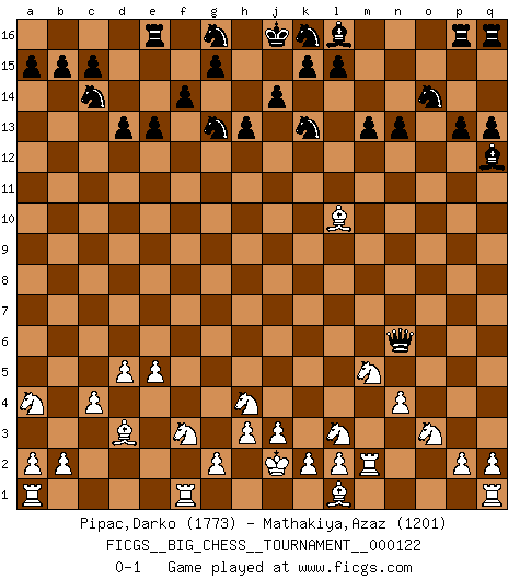 Last move : 0-1 2020 May 26 22:26:4 [Event "FICGS__BIG_CHESS__TOURNAMENT__000122"] [Site "FICGS"] [Date "2020.02.20"] [Round "1"] [White "Pipac,Darko"] [Black "Mathakiya,Azaz"] [Result "0-1"] [WhiteElo "1773"] [BlackElo "1201"] 1.j2-k4 f15-f14 2.h1-o7 b16-c14 3.o7-o15 h15-g13 4.n2-n4 e15-e13 5.k1-l3 q15-q13 6.e2-e4 m15-m13 7.o15-o10 n15-n14 8.m2-m4 f16-c13 9.d2-d4 c13-g9 10.g1-f3 o16-l13 11.c1-n11 j15-k13 12.n11-l13 g9-l13 13.o10-j5 q16-q15 14.f1-d3 q15-q16 15.b1-c3 p16-o14 16.p1-o3 l13-o10 17.j5-p5 o10-f2 18.e1-f1 f2-q12 19.o1-h7 m16-p16 20.j1-j2 h16-h15 21.d4-d5 d15-d13 22.f3-h4 h15-a8 23.p5-q5 p15-p13 24.q5-e16 c16-n6 25.m4-m5 a16-e16 26.m5-n6 a8-h8 27.h7-l10 h14-h13 28.h2-f3 h8-o2 29.m1-m2 o2-b14 30.c3-a4 b14-b10 31.e4-e5 b10-j10 32.c2-c4 j10-n6 33.k4-m5 n14-n13 0-1 This big chess game has been lost on time (started : 2020.02.20 20:38:24) Follow this game move after move (download)A bad plan is better than none at all. (Frank Marshall) Alles was am Schachbrett zählt sind gute Züge. (Robert James Fischer) El arma más poderosa en el Ajedrez, es tener la próxima movida. (David Bronstein) 'L'échange des dames est un coup dur pour les deux adversaires...' Un journaliste lors d'une partie du match Spassky-Fischer May I never be complete. May I never be content. May I never be perfect. Deliver me, Tyler, from being perfect and complete. (Chuck Palahniuk, Fight Club)
