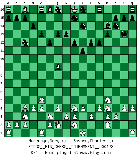 Last move : 0-1 2020 May 27 10:36:40 [Event "FICGS__BIG_CHESS__TOURNAMENT__000122"] [Site "FICGS"] [Date "2020.02.20"] [Round "1"] [White "Nurcahyo,Dery"] [Black "Bovary,Charles"] [Result "0-1"] [WhiteElo ""] [BlackElo ""] 1.k2-k4 k15-k13 2.b1-c3 l15-l13 3.k1-l3 g15-g13 4.g1-f3 m15-m13 5.d2-d4 d15-d14 6.e2-e4 n15-n13 7.f1-c4 p16-o14 8.l1-k2 h14-h13 9.c1-h6 b16-c14 10.n2-n3 f15-f13 11.o1-c12 c14-e13 12.p1-o3 e13-c12 13.m2-m4 l13-l12 14.m1-m2 m13-m12 15.g2-g4 f13-f12 16.h1-g2 h16-a9 17.j1-k1 h15-k14 18.h2-j4 e15-e13 19.k2-j1 a9-a7 20.h6-e3 a7-p7 21.p2-p3 p7-o6 22.o3-q4 o6-q8 23.j1-e5 k13-k12 24.q4-p6 q8-q5 25.p6-n5 k12-k11 26.o2-o3 l16-n14 27.p3-p4 q5-q6 28.m2-n2 j14-j13 29.q2-q4 o16-g9 30.e3-p13 j13-j12 31.l3-n4 q6-p7 32.l2-l3 p7-p13 0-1 This big chess game has been lost on time (started : 2020.02.20 20:38:24) Follow this game move after move (download)In order to improve your game, you must study the endgame before everything else, for whereas the endings can be studied and mastered by themselves, the middle game and the opening must be studied in relation to the endgame. (Jose Raul Capablanca) Ohne Fehler kann es keine Brillanz geben. (Emanuel Lasker) Aunque la mayoría de la gente disfruta observar las partidas de los grandes Maestros de ataque, algunos de los jugadores mas notables en la historia han sido los jugadores silenciosos posicionales. Lentamente ellos te aplastan despojandote de tu espacio, congestionando tus piezas y dejandote virtualmente sin nada que hacer. (Yasser Seirawan) Mais l'homme est une créature légère et illogique : semblable au joueur d'échecs, il n'aime que le processus du but à atteindre, non le but lui-même. (Dostoïevsky) A specialist learns more and more about less and less until he knows everything about nothing. (Nicholas Murray Butler)