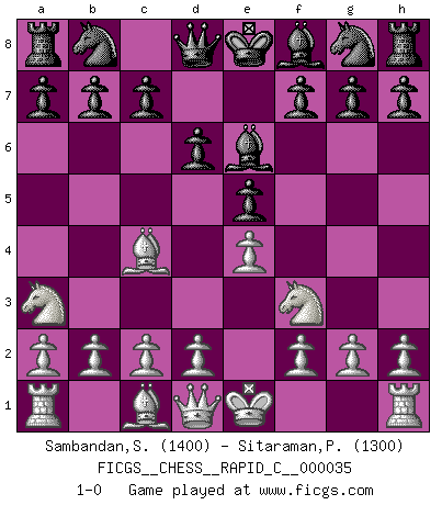 Last move : 1-0 2007 August 17 22:21:22 [Event "FICGS__CHESS__RAPID_C__000035"] [Site "FICGS"] [Date "2007.07.10"] [Round "1"] [White "Sambandan,Sanjiv"] [Black "Sitaraman,Praveen"] [Result "1-0"] [WhiteElo "1400"] [BlackElo "1300"] 1.e4 e5 2.Nf3 d6 3.Bc4 Be6 4.Na3 1-0 Philidor's defense Player White won this chess game. Follow this game move after move (download)We cannot resist the fascination of sacrifice, since a passion for sacrifices is part of a Chessplayer's nature. (Rudolf Spielman) Schach ist das schnellste Spiel der Welt, weil man in jeder Sekunde Tausende von Gedanken ordnen muß. (Albert Einstein) Solo puedes ser bueno en el Ajedrez si amas al juego. (Bobby Fischer) Il n'y a pas de prix trop élevé au scalp de l'ennemi. (Koblentz) The message for business people contemplating their place in the cyberspace is simple and direct: get linked or get lost. (Vic Sussman and Kenan Pollack)