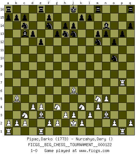 Last move : 1-0 2020 June 6 6:30:50 [Event "FICGS__BIG_CHESS__TOURNAMENT__000122"] [Site "FICGS"] [Date "2020.02.20"] [Round "1"] [White "Pipac,Darko"] [Black "Nurcahyo,Dery"] [Result "1-0"] [WhiteElo "1773"] [BlackElo ""] 1.j2-k4 p16-o14 2.h2-g4 m15-m13 3.b1-c3 k16-l14 4.p1-o3 n15-n13 5.g1-f3 e15-e13 6.k1-l3 o16-d6 7.g4-e5 f16-c13 8.e2-e4 d15-d13 9.d2-d4 l16-n14 10.n2-n4 d6-e5 11.f3-e5 j15-h13 12.m2-m4 h15-j13 13.o1-j6 h16-o10 14.c1-e3 c16-p4 15.h1-q9 p4-o3 16.p2-o3 o10-o3 17.l1-n3 l14-m12 18.n4-n5 q15-q14 19.q9-m5 o3-m5 20.l3-m5 b16-c14 21.f1-b5 g16-f14 22.j1-j2 g15-g13 23.q1-p1 p15-p13 24.l2-l3 e13-e12 25.p1-p8 o14-n12 26.m1-p1 n12-o10 27.p8-p11 o15-o13 28.e5-g4 o13-o12 29.p11-p7 1-0 This big chess game has been lost on time (started : 2020.02.20 20:38:24) Follow this game move after move (download)It is not a move, even the best move that you must seek, but a realizable plan. (Eugene Znosko-Borovsky) Ich bin stolz ein Bulgare zu sein. (Veselin Topalov) Una buena memoria, concentración, imaginación y una fuerte voluntad, se requiere para llegar a ser un buen jugador. (Bobby Fischer) J'ai vu le vaincu d'Echecs jouer des années durant dans l'espoir de la fête de la victoire. Car tu es plus riche de ce qu'elle existe si même elle n'est point pour toi. Ainsi de la perle du fond des mers. (Antoine de Saint-Exupéry) When it is a question of money, everybody is of the same religion. (Voltaire)