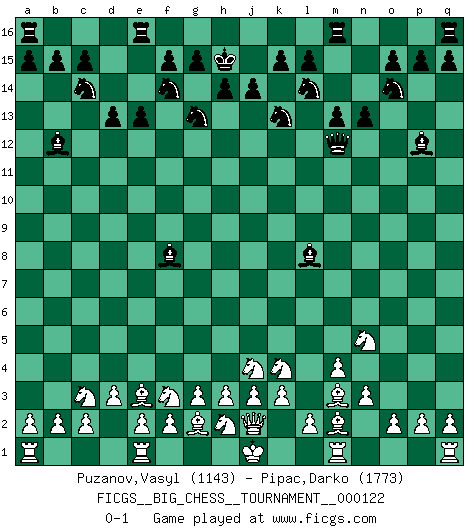 Last move : 0-1 2020 April 30 5:28:22 [Event "FICGS__BIG_CHESS__TOURNAMENT__000122"] [Site "FICGS"] [Date "2020.02.20"] [Round "1"] [White "Puzanov,Vasyl"] [Black "Pipac,Darko"] [Result "0-1"] [WhiteElo "1143"] [BlackElo "1773"] 1.p1-o3 h15-g13 2.b1-c3 j15-k13 3.k1-l3 p16-o14 4.n2-n3 k16-l14 5.g1-f3 b16-c14 6.d2-d3 g16-f14 7.g2-g3 n15-n13 8.m2-m4 m15-m13 9.l1-m2 d15-d13 10.j2-k4 e15-e13 11.f1-g2 f16-b12 12.l3-j4 l16-p12 13.k2-k3 o16-f8 14.h1-j2 c16-m7 15.o3-n5 m7-l8 16.c1-e3 h16-m12 17.o1-m3 j16-h15 0-1 Follow this game move after move (download)Mistrust is the most necessary characteristic of the Chess player. (Siegbert Tarrasch) Schach ist gnadenlos. Du mußt bereit sein zu töten. (Nigel Short) Prefiero perder una partida realmente buena, que ganar una mala. (David Levy) A ce moment-là, je menaçais de comprendre la position ! (Clément L'Heureux) A mistake is only a mistake if you let it happen twice. Otherwise it is a learning experience. (Daniel Parmet)