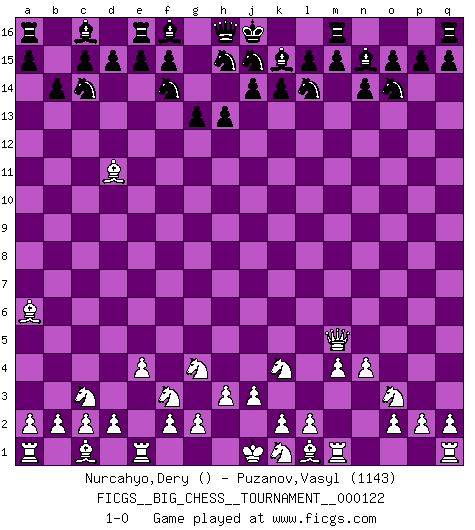 Last move : 1-0 2020 April 23 21:28:34 [Event "FICGS__BIG_CHESS__TOURNAMENT__000122"] [Site "FICGS"] [Date "2020.02.20"] [Round "1"] [White "Nurcahyo,Dery"] [Black "Puzanov,Vasyl"] [Result "1-0"] [WhiteElo ""] [BlackElo "1143"] 1.b1-c3 b16-c14 2.j2-k4 p16-o14 3.p1-o3 k16-l14 4.g1-f3 b15-b14 5.h2-g4 g15-g13 6.e2-e4 n15-n14 7.n2-n4 k15-k14 8.o1-d11 g16-f14 9.f1-a6 l16-k15 10.h1-p8 h14-h13 11.p8-m5 o16-n15 12.m2-m4 1-0 This big chess game has been lost on time (started : 2020.02.20 20:38:24) Follow this game move after move (download)The most powerful weapon in Chess is to have the next move. (David Bronstein) Warum muß ich gegen diesen IDIOTEN verlieren? (Aaron Nimzowitsch) Yo no creo en la psicología. Yo creo en las buenas movidas. (Bobby Fischer) Echiquier : carré parfait, comme la Jérusalem nouvelle décrite par l'auteur de l'Apocalypse, huit cases sur huit, exaltation du chiffre 4, symbole du cosmos aux quatre horizons... où le noir et le blanc, l'ombre et la lumière, le mal et le bien s'entremêlent et se conjuguent. (Robert Couffignal, Le Gambit du poète) History is the quarrels of popes and kings, with wars or pestilences in every page; the men all so good for nothing, and hardly any women at all. (Jane Austen)