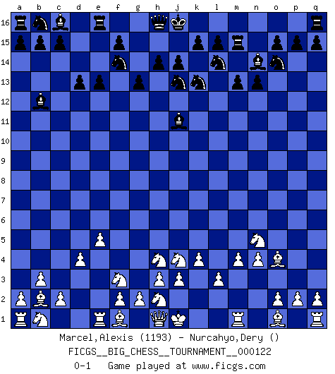 Last move : 0-1 2020 May 4 17:23:44 [Event "FICGS__BIG_CHESS__TOURNAMENT__000122"] [Site "FICGS"] [Date "2020.02.20"] [Round "1"] [White "Marcel,Alexis"] [Black "Nurcahyo,Dery"] [Result "0-1"] [WhiteElo "1193"] [BlackElo ""] 1.b2-b3 j15-k13 2.c1-b2 k16-l14 3.h2-j4 g16-f14 4.j2-h4 p16-o14 5.g1-f3 n15-n13 6.p1-o3 o16-d6 7.k1-h2 g15-g13 8.m2-m4 e15-e13 9.e2-e4 m15-m13 10.n2-n4 f16-b12 11.l2-l3 l16-n14 12.e4-e5 d6-c5 13.d2-d4 c5-j11 14.l1-o4 m16-m15 15.k2-k4 h15-j13 16.o3-n5 d15-d13 0-1 This big chess game has been lost on time (started : 2020.02.20 20:38:24) Follow this game move after move (download)If a ruler does not understand Chess, how can he rule over a kingdom ? (King Khusros II) Wir können eben der zündenden Macht des Opfers nicht wiederstehen, denn die Begeisterung für das Opfer liegt in der Natur des Menschen. (Rudolf Spielmann) El Ajedrez es un juego terrible. Si no dominas el centro, tu oponente tiene una posición mas libre. Si tu tienes el centro, entonces realmente tienes algo de que preocuparte. (Siegbert Tarrasch) Les écrivains ont utilisé les échecs pour analyser les côtés extrêmes de la nature humaine. Dans ce cadre, les échecs offrent un champ d'expérimentation idéal. Mais on pourrait faire la même chose avec la peinture. Et là, en vous référant à Van Gogh, vous ne tirerez pas de conclusion définitive sur les peintres. (Gary Kasparov) A shortcut is the longest distance between two points. (Don Groves)
