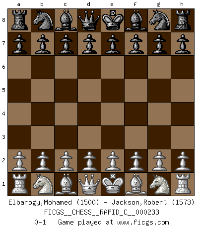 Last move : 0-1 2020 March 27 6:50:55 [Event "FICGS__CHESS__RAPID_C__000233"] [Site "FICGS"] [Date "2020.02.25"] [Round "1"] [White "Elbarogy,Mohamed"] [Black "Jackson,Robert"] [Result "0-1"] [WhiteElo "1500"] [BlackElo "1573"] 0-1 This chess game has been lost on time (started : 2020.02.25 22:40:24) Player Black won this chess game. Follow this game move after move (download)Pawns: they are the soul of this game, they alone form the attack and defense. (Philidor) Immer nach dem besten Zug zu suchen ist ziemlich unpraktisch. (Nigel Short) Una mala movida nulifica cuarenta buenas. (Horowitz) Le profane ne songe pas à la somme de jouissance dont il se prive, qui méconnaît ce jeu aux ressources aussi variées que passionnantes. (Jean-Marie Jeanton-Lamarche) If you don't practice you don't deserve to win. (Andre Agassi)