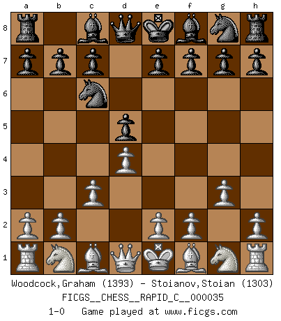 Last move : 1-0 2007 August 13 15:27:46 [Event "FICGS__CHESS__RAPID_C__000035"] [Site "FICGS"] [Date "2007.07.10"] [Round "1"] [White "Woodcock,Graham"] [Black "Stoianov,Stoian"] [Result "1-0"] [WhiteElo "1393"] [BlackElo "1303"] 1.d4 d5 2.g3 Nc6 3.c3 1-0 This chess game has been lost on time (started : 2007.07.10 2:13:33) Queen's pawn game Player White won this chess game. Follow this game move after move (download)Chess is above all, a fight ! (Emanuel Lasker) Das Schach ist nichts für kleine Geister, es beansprucht einen vollen Mann, der sich nicht sklavisch an das Überlieferte hält, sondern selbständig die Tiefen des Spiels zu ergründen sucht. (Wilhelm Steinitz) La batalla por la última verdad nunca sera ganada. Y es por eso que el Ajedrez es tan fascinante. (Hans Kmoch) Lorsque vous vous retrouvez devant une position atroce, ne tendez pas un ultime piège dérisoire avec l'intention d'abandonner si l'adversaire le déjoue ! Faites-vous plutôt un devoir de résister comme si votre vie en dépendait. Jouez le coup qui vous déplairait au centuple si vous étiez dans la peau de votre tortionnaire ! Luck never made a man wise. (Seneca, Letters to Lucilius)