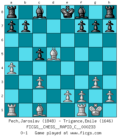 Last move : 0-1 2020 May 25 7:16:22 [Event "FICGS__CHESS__RAPID_C__000233"] [Site "FICGS"] [Date "2020.02.25"] [Round "1"] [White "Pech,Jaroslav"] [Black "Trigance,Emile"] [Result "0-1"] [WhiteElo "1848"] [BlackElo "1646"] 1.d4 d5 2.c4 c6 3.Nf3 Nf6 4.Nc3 dxc4 5.a4 Bf5 6.Ne5 Nbd7 7.Nxc4 Qc7 8.g3 e5 9.dxe5 Ne4 10.Bg2 Nxc3 11.bxc3 Nxe5 12.Nxe5 Qxe5 13.Qd4 Qe6 14.O-O c5 15.Qd5 Qxd5 16.Bxd5 Bc8 0-1 This chess game has been lost on time (started : 2020.02.25 22:40:24) QGD Slav : Krause attack Kingside Castling by player White (move 14) Player Black won this chess game. Follow this game move after move (download)When I asked Fischer why he had not played a certain move in our game, he replied: 'Well, you laughed when I wrote it down !' (Mikhail Tal) Im Leben werden Partien nie so unstrittig gewonnen wie im Spiel (Emanuel Lasker) Por la belleza de sus partidas, la claridad de su juego y lo brillante de sus ideas, Fischer se creó el mismo como un artista de la misma estatura como Brahms, Rembrandt y Shakespeare. (David Levy) Aucun coup ne doit être joué sans but. (Pedro Damiano) The beginning is the most important part of the work. (Plato)