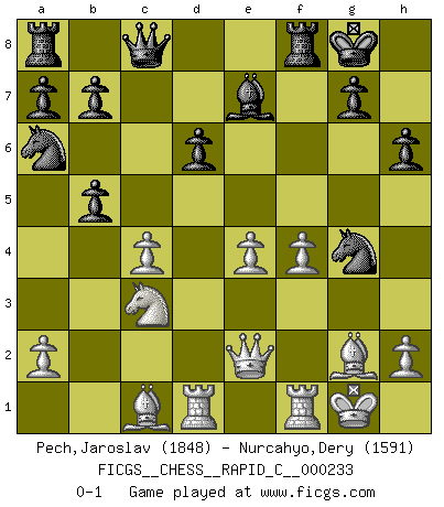 Last move : 0-1 2020 June 18 11:14:19 [Event "FICGS__CHESS__RAPID_C__000233"] [Site "FICGS"] [Date "2020.02.25"] [Round "1"] [White "Pech,Jaroslav"] [Black "Nurcahyo,Dery"] [Result "0-1"] [WhiteElo "1848"] [BlackElo "1591"] 1.c4 e5 2.Nc3 Nf6 3.Nf3 d6 4.d4 exd4 5.Nxd4 Be7 6.g3 c6 7.Bg2 Na6 8.O-O Be6 9.Nxe6 fxe6 10.e4 e5 11.Be3 O-O 12.Qe2 h6 13.Rad1 Qc8 14.f4 Ng4 15.Bc1 exf4 16.gxf4 Nc5 17.b4 Na6 18.b5 cxb5 0-1 English Opening Kingside Castling by player White (move 8) Kingside Castling by player Black (move 11) Player Black won this chess game. Follow this game move after move (download)Play the opening like a book, the middle game like a magician, and the endgame like a machine. (Spielmann) Schach ist ein schwarz-weisser Dschungel. (Garry Kasparov) Peones: ellos son el alma de esta partida, solos forman el ataque y la defensa. (Philidor) Nous vivons dans un monde échiquéen : chaque jour qui passe est un défi à relever. (Philosophe Sasha) Wisdom doesn't necessarily come with age. Sometimes age just shows up all by itself. (Tom Wilson)