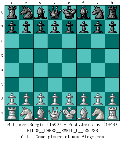 Last move : 0-1 2020 March 27 6:50:55 [Event "FICGS__CHESS__RAPID_C__000233"] [Site "FICGS"] [Date "2020.02.25"] [Round "1"] [White "Milionar,Sergio"] [Black "Pech,Jaroslav"] [Result "0-1"] [WhiteElo "1500"] [BlackElo "1848"] 0-1 This chess game has been lost on time (started : 2020.02.25 22:40:24) Player Black won this chess game. Follow this game move after move (download)Chess mastery essentially consists of analyzing Chess positions accurately. (Mikhail Botvinnik) Ich war zu klein für die Schach-Schülermannschaft! (Woody Allen) Sin errores no puede haber brillantez. (Emanuel Lasker) Pour se monter efficace, un Cavalier a besoin d'avant-postes ! Les Cavaliers font les meilleurs bloqueurs de pions passés. They say poker is a zero-sum game. It must be, because every time I play my sum ends up zero. (Max Shapiro)