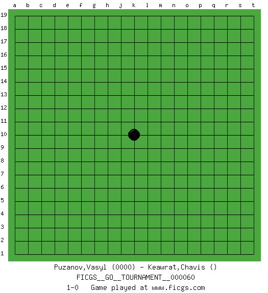 Last move : 1-0 2020 March 28 0:7:47 [Event "FICGS__GO__TOURNAMENT__000060"] [Site "FICGS"] [Date "2020.02.26"] [Round "1"] [Black "Puzanov,Vasyl"] [White "Keawrat,Chavis"] [Result "1-0"] [Rating 1 "0000"] 1.k10 1-0 This go game has been lost on time (started : 2020.02.26 10:28:50) Here are the names of the openings (joseki) played in the four corners : Player Black won this Go (weiqi, baduk) game. Follow this game move after move (download)There are players who don't accept exchange: they play many moves that perpetuate a previous state of the game. (Pierre Audouard) No enterprise is more likely to succeed than one concealed from the enemy until it is ripe for execution. (Niccolo Machiavelli)