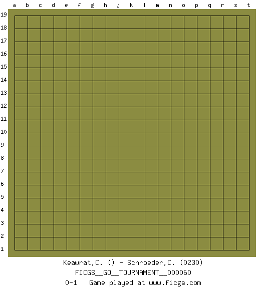 Last move : 0-1 2020 March 28 0:7:47 [Event "FICGS__GO__TOURNAMENT__000060"] [Site "FICGS"] [Date "2020.02.26"] [Round "1"] [Black "Keawrat,Chavis"] [White "Schroeder,Christoph"] [Result "0-1"] [Rating 2 "0230"] 0-1 This go game has been lost on time (started : 2020.02.26 10:28:50) Here are the names of the openings (joseki) played in the four corners : Player White won this Go (weiqi, baduk) game. Follow this game move after move (download)To invade, need 20 points in open area; otherwise, keshi is best. (Yang Yilun, 7p) If you work for a living, why do you kill yourself working ? (Tuco to a chicken in The Good, The Bad and The Ugly)