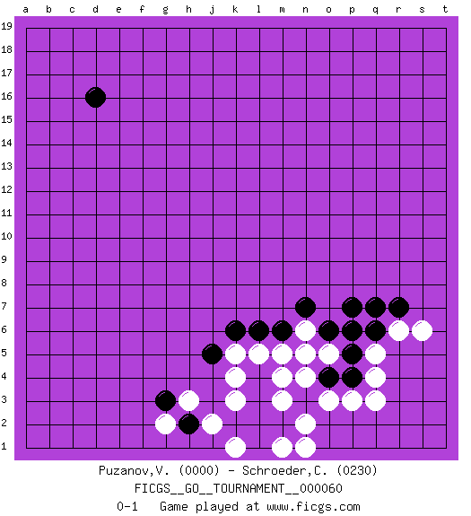 Last move : 0-1 2020 March 6 4:7:53 [Event "FICGS__GO__TOURNAMENT__000060"] [Site "FICGS"] [Date "2020.02.26"] [Round "1"] [Black "Puzanov,Vasyl"] [White "Schroeder,Christoph"] [Result "0-1"] [Rating 1 "0000"] [Rating 2 "0230"] 1.d16 q4 2.p4 p3 3.p5 q5 4.q6 r6 5.p6 q3 6.o4 o3 7.n3 n2 8.m2 m1 9.l1 n1 10.r7 s6 11.q7 m3 12.l2 n4 13.n5 m4 14.l3 m5 15.l4 l5 16.m6 n6 17.o6 o5 18.n7 n5 19.l6 k5 20.k6 k4 21.j5 k3 22.k2 j2 23.h2 k1 24.p7 h3 25.g3 g2 0-1 Here are the names of the openings (joseki) played in the four corners : Corner q4 : q4 p4 Hoshi (Hwajeom, Seongjeom, Xingwei`) 4-4 Point. The star or hoshi (4-4) point, emphasizing influence at the potential expense of territory. Corner d4 : j5 j2 This joseki is unknown. A weak or weird move has probably been played in this corner. Player White won this Go (weiqi, baduk) game. Follow this game move after move (download)Don't defend - extend ! (Bill Taylor) The worth of a book is to be measured by what you can carry away from it. (James Bryce)