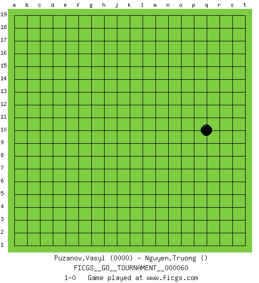 Last move : 1-0 2020 March 28 0:7:47 [Event "FICGS__GO__TOURNAMENT__000060"] [Site "FICGS"] [Date "2020.02.26"] [Round "1"] [Black "Puzanov,Vasyl"] [White "Nguyen,Truong"] [Result "1-0"] [Rating 1 "0000"] 1.q10 1-0 This go game has been lost on time (started : 2020.02.26 10:28:50) Here are the names of the openings (joseki) played in the four corners : Player Black won this Go (weiqi, baduk) game. Follow this game move after move (download)Go is to western chess what philosophy is to double entry accounting. (from Shibumi, by Trevanian) A good programmer is someone who always looks both ways before crossing a one-way street. (Doug Linder)