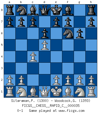 Last move : 0-1 2007 August 17 22:21:53 [Event "FICGS__CHESS__RAPID_C__000035"] [Site "FICGS"] [Date "2007.07.10"] [Round "1"] [White "Sitaraman,Praveen"] [Black "Woodcock,Graham"] [Result "0-1"] [WhiteElo "1300"] [BlackElo "1393"] 1.d4 d6 2.d5 Nf6 3.c4 g6 0-1 Queen's Pawn Player Black won this chess game. Follow this game move after move (download)There are two types of sacrifices: correct ones and mine. (Mikhail Tal) Wenn Du einsam bist, wenn Du Dich in der Welt wie ein Fremder fühlst, spiele Schach. Das wird Deinen Geist erheben und Dein Ratgeber im Kampf sein. (Aristoteles) El Ajedrez no es como la vida... ¡tiene reglas!. (Mark Pasternak) Les échecs sont plus proches de l'art de l'assassinat que de l'art de la guerre. (Arturo Perez-Reverte) Dave, my mind is going. I can feel it. (HAL 9000 in 2001, a space odyssey)
