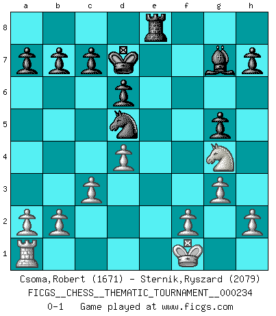 Last move : 0-1 2020 April 16 8:9:11 [Event "FICGS__CHESS__THEMATIC_TOURNAMENT__000234"] [Site "FICGS"] [Date "2020.02.28"] [Round "1"] [White "Csoma,Robert"] [Black "Sternik,Ryszard"] [Result "0-1"] [WhiteElo "1671"] [BlackElo "2079"] 1.e4 e5 2.Nf3 Nf6 3.Nxe5 d6 4.Nd3 Nxe4 5.Qe2 Qe7 6.g3 Nc6 7.c3 Nf6 8.Bg2 Bf5 9.Nf4 g5 10.Qxe7+ Kxe7 11.Nd5+ Nxd5 12.Bxd5 Bd3 13.Na3 Re8 14.Bc4 Kd7 15.Kd1 Be4 16.Re1 Bh6 17.d4 Bf3+ 18.Be2 Rxe2 19.Rxe2 Re8 20.Be3 f5 21.Kd2 Bxe2 22.Kxe2 f4 23.Nc2 fxe3 24.Nxe3 Ne7 25.Ng4 Nd5 26.Kf1 Bg7 0-1 Petrov's defense Player Black won this chess game. Follow this game move after move (download)Discovered check is the dive bomber of the Chessboard. (Reuben Fine) Ich verlor meine Bürgerrechte, mein Gehalt wurde mir nicht mehr bezahlt und ich wurde zensiert und durfte nicht mehr ins Ausland reisen. [nach dem Match Fischer-Taimanov 6:0] (Mark Taimanov) Realmente no sabemos como el juego fue inventado, aunque hay sospechas. Tan pronto como descubramos a los culpables, se los haremos saber. (Bruce Pandolfini) Lorsque vous vous retrouvez devant une position atroce, ne tendez pas un ultime piège dérisoire avec l'intention d'abandonner si l'adversaire le déjoue ! Faites-vous plutôt un devoir de résister comme si votre vie en dépendait. Jouez le coup qui vous déplairait au centuple si vous étiez dans la peau de votre tortionnaire ! Wipe them out. All of them. (Darth Sidious in Star Wars ep.1)