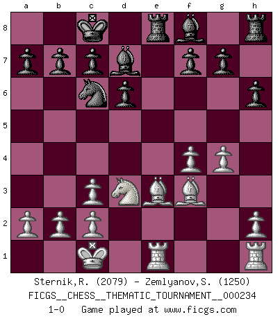 Last move : 1-0 2020 May 31 19:45:20 [Event "FICGS__CHESS__THEMATIC_TOURNAMENT__000234"] [Site "FICGS"] [Date "2020.02.28"] [Round "1"] [White "Sternik,Ryszard"] [Black "Zemlyanov,Sergey"] [Result "1-0"] [WhiteElo "2079"] [BlackElo "1250"] 1.e4 e5 2.Nf3 Nf6 3.Nxe5 d6 4.Nd3 Nxe4 5.Qe2 Qe7 6.Nc3 Nxc3 7.dxc3 Bg4 8.f3 Qxe2+ 9.Bxe2 Bf5 10.g4 Bd7 11.f4 Nc6 12.Be3 O-O-O 13.Bf3 h6 14.O-O-O Re8 15.Rde1 1-0 This chess game has been lost on time (started : 2020.02.28 15:54:27) Petrov's defense Queenside Castling by player Black (move 12) Queenside Castling by player White (move 14) Player White won this chess game. Follow this game move after move (download)Chess books should be used as we use glasses: to assist the sight, although some players make use of them as if they thought they conferred sight. (Jose Raul Capablanca) Im Reiche der Wirklichkeit ist man nie so glücklich wie im Reiche der Gedanken. (Arthur Schopenhauer) El Ajedrez es tan interesante por sí solo, que no es necesario un interés monetario para persuadir a una persona a que lo practique; por lo tanto, nunca se juega por dinero. (Benjamin Franklin) 'L'échange des dames est un coup dur pour les deux adversaires...' Un journaliste lors d'une partie du match Spassky-Fischer Happy endings are just stories that haven't finished yet. (Jane Smith in Mr & Mrs Smith)