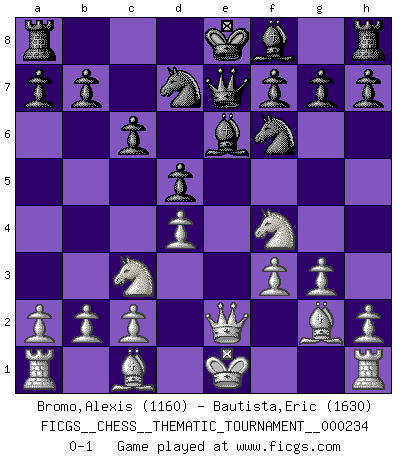 Last move : 0-1 2020 June 7 10:17:55 [Event "FICGS__CHESS__THEMATIC_TOURNAMENT__000234"] [Site "FICGS"] [Date "2020.02.28"] [Round "1"] [White "Bromo,Alexis"] [Black "Bautista,Eric"] [Result "0-1"] [WhiteElo "1160"] [BlackElo "1630"] 1.e4 e5 2.Nf3 Nf6 3.Nxe5 d6 4.Nd3 Nxe4 5.Qe2 Qe7 6.g3 c6 7.Bg2 Nf6 8.Nc3 Bg4 9.f3 Be6 10.Nf4 Nbd7 11.d4 d5 0-1 This chess game has been lost on time (started : 2020.02.28 15:54:27) Petrov's defense Player Black won this chess game. Follow this game move after move (download)The laws of Chess do not permit a free choice: you have to move whether you like it or not. (Emanuel Lasker) Die Auseinandersetzung mit Karpow war politisch geprägt. Er stand für das kommunistische System, wurde von dessen Repräsentanten gehätschelt. Ich war der Oppositionelle. Jeder Schachweltmeister spiegelt auch die gesellschaftlichen Verhältnisse wider. Kramnik steht für die Börsen-Generation des Neuen Markts, ideologiefrei, zahlenfixiert. (Garry Kasparov) La vida es como un juego de Ajedrez, cambiando con cada movimiento. (Proverbio Chino) Je ne suis pas le dernier à jouer lâchement des coups douteux pendant le zeïtnot de l'adversaire pour l'achever: en effet les coups qui font le plus peur sont ceux que l'on ne comprend pas. Je me fais souvent peur quand je joue. (Un professeur anonyme) Horse racing is animated roulette. (Roger Kahn)