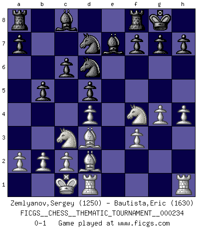 Last move : 0-1 2020 June 6 19:20:10 [Event "FICGS__CHESS__THEMATIC_TOURNAMENT__000234"] [Site "FICGS"] [Date "2020.02.28"] [Round "1"] [White "Zemlyanov,Sergey"] [Black "Bautista,Eric"] [Result "0-1"] [WhiteElo "1250"] [BlackElo "1630"] 1.e4 e5 2.Nf3 Nf6 3.Nxe5 d6 4.Nd3 Nxe4 5.Nc3 Nf6 6.Nf4 c6 7.d4 d5 8.Bd3 Bd6 9.Qe2+ Qe7 10.f3 O-O 11.Qxe7 Bxe7 12.Bd2 Nbd7 13.g4 Ne8 14.h4 Nd6 15.O-O-O b5 0-1 This chess game has been lost on time (started : 2020.02.28 15:54:27) Petrov's defense Kingside Castling by player Black (move 10) Queenside Castling by player White (move 15) Player Black won this chess game. Follow this game move after move (download)In order to improve your game, you must study the endgame before everything else, for whereas the endings can be studied and mastered by themselves, the middle game and the opening must be studied in relation to the endgame. (Jose Raul Capablanca) Ich weiss nicht was Gott gegen mich auf 1.e4 antworten würde. (Robert James Fischer) Solo existe una cosa que Fischer hace en el Ajedrez sin placer: ¡perder!. (Boris Spassky) Si le désir cupide (et stupide) de gagner est une inépuisable source de souffrance, une combinaison brillante sur l'échiquier est une découverte : le coquelicot qui s'épanouit lorsque apparaît la Voie Lactée. (Arrabal) When a man with money meets a man with experience, the man with experience leaves with money and the man with money leaves with experience. (Anonymous)