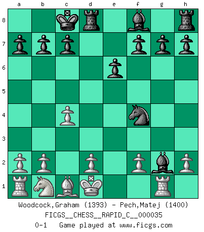 Last move : 0-1 2007 September 13 12:59:43 [Event "FICGS__CHESS__RAPID_C__000035"] [Site "FICGS"] [Date "2007.07.10"] [Round "1"] [White "Woodcock,Graham"] [Black "Pech,Matej"] [Result "0-1"] [WhiteElo "1393"] [BlackElo "1400"] 1.e4 Nf6 2.e5 Nd5 3.Nf3 d6 4.c3 dxe5 5.Nxe5 Nd7 6.Nxd7 Bxd7 7.Qf3 e6 8.c4 Nb4 9.Bd3 Bc6 10.Qg3 Qxd3 11.Qxd3 Nxd3+ 12.Ke2 Nf4+ 13.Kd1 Bxg2 14.Rg1 O-O-O 0-1 Alekhine's defense Queenside Castling by player Black (move 14) Player Black won this chess game. Follow this game move after move (download)I have never in my life played the French Defence, which is the dullest of all openings. (Wilhelm Steinitz) Kann Schach nicht schließlich das Nationalspiel der Deutschen werden? Und welche weiteren Ausblicke bieten sich dann dar! Welche Hebung des allgemeinen Kultur-Niveaus, ja der Moral, wenn das Schachbrett den Kartentisch verdrängen würde! Wahrlich, ein Ziel, des Schweißes der Edlen wert! (Siegbert Tarrasch) Antes de los Finales, los dioses han colocado el Juego Medio. (Siegbert Tarrasch) A chaque perte on perd un peu de soi. (Joël Lautier) After growing wildly for years, the field of computing appears to be reaching its infancy. (John Pierce)
