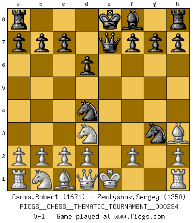 Last move : 0-1 2020 March 17 19:24:9 [Event "FICGS__CHESS__THEMATIC_TOURNAMENT__000234"] [Site "FICGS"] [Date "2020.02.28"] [Round "1"] [White "Csoma,Robert"] [Black "Zemlyanov,Sergey"] [Result "0-1"] [WhiteElo "1671"] [BlackElo "1250"] 1.e4 e5 2.Nf3 Nf6 3.Nxe5 d6 4.Nd3 Nxe4 5.Qe2 Qe7 6.g3 Nc6 7.Bg2 Bh3 8.Bxh3 Nd4 9.Qd1 Nxg3 0-1 Petrov's defense Player Black won this chess game. Follow this game move after move (download)Mistrust is the most necessary characteristic of the Chess player. (Siegbert Tarrasch) Schach ist gnadenlos. Du mußt bereit sein zu töten. (Nigel Short) La esencia del Ajedrez es pensar acerca de lo que el Ajedrez es. (David Bronstein) Les pièces de l'échiquier étaient impitoyables. Elles le retenaient, elles l'absorbaient. Il y avait de l'horreur en cela, mais aussi une harmonie unique. Car, qu'y a-t-il dans le monde, à part les échecs ? (V. Nabokov) When you stop learning you start dying. (Scott Adams)