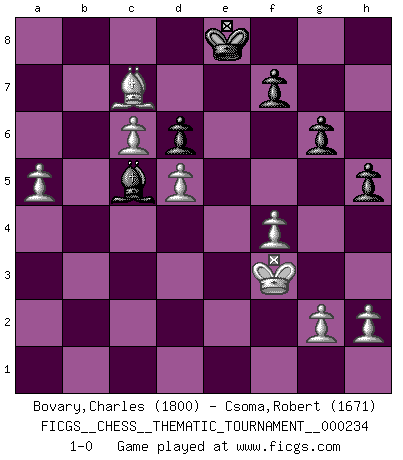 Last move : 1-0 2020 May 7 18:52:25 [Event "FICGS__CHESS__THEMATIC_TOURNAMENT__000234"] [Site "FICGS"] [Date "2020.02.28"] [Round "1"] [White "Bovary,Charles"] [Black "Csoma,Robert"] [Result "1-0"] [WhiteElo "1800"] [BlackElo "1671"] 1.e4 e5 2.Nf3 Nf6 3.Nxe5 d6 4.Nd3 Nxe4 5.Nc3 Nf6 6.Nf4 Be7 7.d4 O-O 8.d5 Re8 9.Bd3 Bf8 10.Nce2 b6 11.O-O Bb7 12.c4 Nbd7 13.Ng3 Ne5 14.Nf5 Nxd3 15.Qxd3 g6 16.Nd4 Bg7 17.Bd2 Qd7 18.Rfe1 Rxe1+ 19.Rxe1 Re8 20.Rxe8+ Nxe8 21.b3 Qe7 22.Be3 Nf6 23.f3 a6 24.Nc6 Bxc6 25.dxc6 Qe8 26.Nd5 Nxd5 27.cxd5 b5 28.Kf2 Qe5 29.a4 bxa4 30.bxa4 a5 31.Qb3 h5 32.f4 Qb2+ 33.Qxb2 Bxb2 34.Bb6 Ba3 35.Bxa5 Bc5+ 36.Kf3 Kf8 37.Bxc7 Ke8 38.a5 1-0 Petrov's defense Kingside Castling by player Black (move 7) Kingside Castling by player White (move 11) Player White won this chess game. Follow this game move after move (download)Weak points or holes in the opponent's position must be occupied by pieces not Pawns. (Siegbert Tarrasch) Bogoljubow: Matt in vier Zügen! Tartakower: Ich verbitte mir jede Belästigung! (Savielly Grigorievitsch Tartakower) a manera como él juega al Ajedrez, demuestra la completa naturaleza de un hombre. (Stanley Ellin) On peut tirer plus d'utilité d'une partie perdue que de 100 parties gagnées. (Capablanca) Creativity involves breaking out of established patterns in order to look at things in a different way. (Edward De Bono)