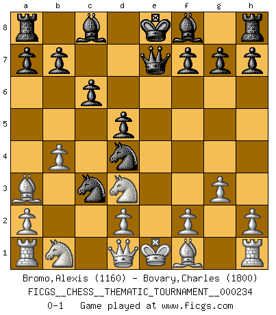 Last move : 0-1 2020 March 1 8:16:0 [Event "FICGS__CHESS__THEMATIC_TOURNAMENT__000234"] [Site "FICGS"] [Date "2020.02.28"] [Round "1"] [White "Bromo,Alexis"] [Black "Bovary,Charles"] [Result "0-1"] [WhiteElo "1160"] [BlackElo "1800"] 1.e4 e5 2.Nf3 Nf6 3.Nxe5 d6 4.Nd3 Nxe4 5.Qe2 Qe7 6.b4 d5 7.g3 Nc6 8.Ba3 Nd4 9.Qd1 c6 10.c3 Nxc3 0-1 Petrov's defense Player Black won this chess game. Follow this game move after move (download)Castle early and often. (Rob Sillars) Ich bewundere Kasparows phantasievolle Angriffssiege aus den Achtzigern und Neunzigern, aber wenn man sie mit dem Computer überprüft, nimmt der Computer in jeder zweiten Partie die Opfer an, verteidigt sich und gewinnt. (Vladimir Kramnik) Muchos jugadores de Ajedrez se sorprendían cuando después de la partida, Fischer explicaba con calma: 'Yo ya había analizado esta posibilidad' en una posición en la cual yo creía que no era posible de prever desde la apertura. (Mikhail Tal) Un journaliste : 'Vous préférez avoir une dame de plus sur l'échiquier ou au lit ?' Boris Spassky : 'Ca dépend de la position.' Tree pose grows confidence. It roots me to this world. (Terri Guillemets)