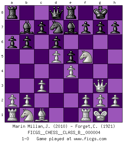 Last move : 1-0 2006 July 24 11:28:4 [Event "FICGS__CHESS__CLASS_B__000004"] [Site "FICGS"] [Date "2006.06.19"] [Round "1"] [White "Marin Millan,Jose Antonio"] [Black "Forget,Cyril"] [Result "1-0"] [WhiteElo "2010"] [BlackElo "1921"] 1.e4 b6 2.d4 Bb7 3.Bd3 Nf6 4.Qe2 Nc6 5.c3 e5 6.d5 Nb8 7.Nf3 d6 8.O-O Be7 9.Nh4 O-O 10.Nf5 Re8 11.Qf3 Nbd7 12.Bb5 a6 13.Bxd7 Nxd7 14.Qg3 1-0 Owen defense Kingside Castling by player White (move 8) Kingside Castling by player Black (move 9) Player White won this chess game. Follow this game move after move (download)Winning isn't everything... but losing is nothing. (Mednis) Dass jemand wie Surab Asmaiparaschwili, der selbst Elopunkte gekauft hat , Vize-Präsident der Fide werden konnte, sagt schon einges über den Zustand dieser Organisation aus. (Joel Lautier) Una de estas pequeñas movidas modestas pudieran ser mas molestas a tu oponente que la amenaza mas grande. (Siegbert Tarrasch) Psychologiquement, tu dois avoir confiance en toi même, mais cette confiance doit être basée sur des faits. (Robert Fischer) Perhaps chess is the wrong game for the times (The Chess Master and the Computer, by Garry Kasparov - 2010)