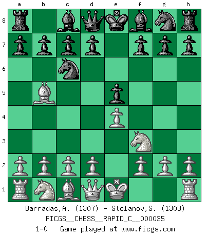 Last move : 1-0 2007 August 12 3:19:15 [Event "FICGS__CHESS__RAPID_C__000035"] [Site "FICGS"] [Date "2007.07.10"] [Round "1"] [White "Barradas,Anderson"] [Black "Stoianov,Stoian"] [Result "1-0"] [WhiteElo "1307"] [BlackElo "1303"] 1.e4 e5 2.Nf3 Nc6 3.Bb5 1-0 This chess game has been lost on time (started : 2007.07.10 2:13:33) Ruy Lopez (Spanish Opening) Player White won this chess game. Follow this game move after move (download)Daring ideas are like Chess men moved forward. They may be beaten, but they may start a winning game. (Johann Wolfgang von Goethe) Taktik ist was man tun muß, wenn etwas zu tun ist. Strategie ist was man tun muß, wenn nichts zu tun ist. (Savielly Grigorievitsch Tartakower) Yo he agregado estos principios a la ley: pongan los Caballos en acción antes de que los dos Alfiles sean desarrollados. (Emanuel Lasker) Je ne suis pas le dernier à jouer lâchement des coups douteux pendant le zeïtnot de l'adversaire pour l'achever: en effet les coups qui font le plus peur sont ceux que l'on ne comprend pas. Je me fais souvent peur quand je joue. (Un professeur anonyme) Life is painting a picture, not doing a sum. (Oliver Wendell Holmes, Jr.)