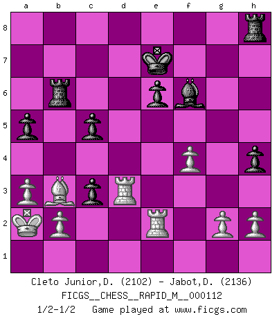 Last move : 1/2-1/2 2020 May 1 17:22:24 [Event "FICGS__CHESS__RAPID_M__000112"] [Site "FICGS"] [Date "2020.02.29"] [Round "1"] [White "Cleto Junior,Dirceu"] [Black "Jabot,Daniel"] [Result "1/2-1/2"] [WhiteElo "2102"] [BlackElo "2136"] 1.e4 c5 2.Nf3 d6 3.d4 cxd4 4.Nxd4 Nc6 5.Nc3 Nf6 6.Bg5 e6 7.Qd2 a6 8.O-O-O Qb6 9.Nxc6 bxc6 10.Bc4 Rb8 11.Bb3 Be7 12.f4 h6 13.Bxf6 gxf6 14.Rhe1 Kf8 15.Kb1 h5 16.a3 a5 17.Ka1 Qa7 18.Na4 Qc7 19.Re3 Bd7 20.Nc3 f5 21.Qd4 Rh6 22.exf5 Qb6 23.Qxb6 Rxb6 24.fxe6 fxe6 25.Ne4 d5 26.Ba4 h4 27.Nd2 Be8 28.Nf3 Bh5 29.Rde1 Bxf3 30.Rxf3 Bf6 31.c3 c5 32.Ka2 Ke7 33.Rd3 d4 34.Bb3 Rh8 35.Re2 dxc3 1/2-1/2 Sicilian Queenside Castling by player White (move 8) This chess game ended in a draw. Follow this game move after move (download)White lost because he failed to remember the right continuation and had to think up the moves himself. (Siegbert Tarrasch) Spiel ein langweiliges Spiel zu Ende und lustige Dinge können passieren. (Hans Ree) Yo nunca en mi vida he jugado la Defensa Francesa, que viene siendo la más aburrida de todas las Aperturas. (Wilhelm Steinitz) Il s'avisa de me proposer d'apprendre les échecs qu'il jouait un peu... me voilà forcené des échecs. J'achète un échiquier, je m'enferme dans ma chambre, j'y passe des jours et des nuits à vouloir apprendre par cur toutes les parties. (Jean-Jacques Rousseau, Confessions) I fear not the man who has practiced 10,000 kicks once, but I fear the man who has practiced one kick 10,000 times. (Bruce Lee)
