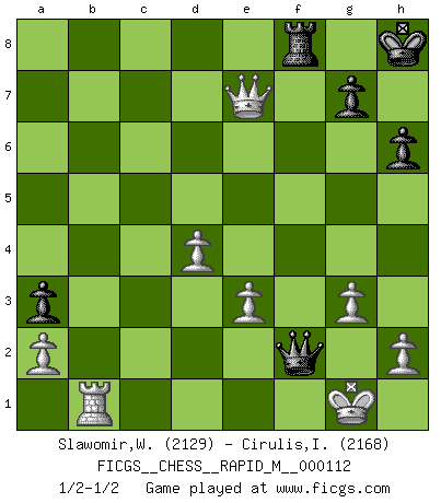 Last move : 1/2-1/2 2020 March 16 7:25:12 [Event "FICGS__CHESS__RAPID_M__000112"] [Site "FICGS"] [Date "2020.02.29"] [Round "1"] [White "Slawomir,Weglicki"] [Black "Cirulis,Ilmars"] [Result "1/2-1/2"] [WhiteElo "2129"] [BlackElo "2168"] 1.d4 f5 2.g3 Nf6 3.Bg2 c6 4.Nh3 d5 5.O-O e6 6.c4 Be7 7.b3 O-O 8.Nd2 a5 9.Bb2 a4 10.Nf4 a3 11.Bc3 Bd6 12.e3 b6 13.Rb1 Re8 14.Qc2 Nbd7 15.b4 Ne4 16.Nxe4 fxe4 17.f3 exf3 18.Bxf3 Nf6 19.Nh5 Nxh5 20.Bxh5 Rf8 21.Bg4 Be7 22.Qe2 Kh8 23.Rxf8+ Bxf8 24.Bf3 Qe8 25.Bg2 Ba6 26.b5 Bb7 27.Qd2 h6 28.Bb4 Bxb4 29.Qxb4 dxc4 30.Qxc4 cxb5 31.Qxb5 Qc8 32.Bxb7 Qxb7 33.Qxb6 Qf3 34.Qxe6 Rf8 35.Qe7 Qf2+ 1/2-1/2 Dutch defense Kingside Castling by player White (move 5) Kingside Castling by player Black (move 7) This chess game ended in a draw. Follow this game move after move (download)It was clear to me that the vulnerable point of the American Grandmaster (Bobby Fischer) was in double-edged, hanging, irrational positions, where he often failed to find a win even in a won position. (Efim Geller) Es ist wirklich schade, dass so viele Schachspieler nicht auf ihr Äußeres achten! (Alexandra Kosteniuk) ¿Quién es tu oponente esta tarde? Esta tarde mi oponente son las piezas negras. (Akiba Rubinstein) Des points faibles ou des trous dans la position de l'adversaire doivent être occupés par des pièces et non pas par des pions. (Siegbert Tarrasch) Internal peace cannot coexist with external war. (Don Groves)
