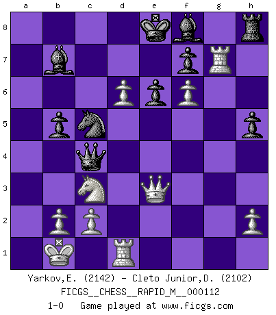 Last move : 1-0 2020 April 18 23:41:59 [Event "FICGS__CHESS__RAPID_M__000112"] [Site "FICGS"] [Date "2020.02.29"] [Round "1"] [White "Yarkov,Evgeny"] [Black "Cleto Junior,Dirceu"] [Result "1-0"] [WhiteElo "2142"] [BlackElo "2102"] 1.e4 c5 2.Nf3 d6 3.d4 cxd4 4.Nxd4 Nf6 5.Nc3 a6 6.Bg5 e6 7.f4 Be7 8.Qf3 Qc7 9.O-O-O Nbd7 10.g4 b5 11.Bxf6 Nxf6 12.g5 Nd7 13.f5 Nc5 14.f6 gxf6 15.gxf6 Bf8 16.Rg1 h5 17.a3 Qb6 18.Kb1 b4 19.axb4 Qxb4 20.Rg7 Rb8 21.Bb5+ Rxb5 22.Ndxb5 axb5 23.e5 Bb7 24.Qe3 Qc4 25.exd6 1-0 Sicilian : Najdorf, 7...Be7 Queenside Castling by player White (move 9) Player White won this chess game. Follow this game move after move (download)The winner of the game is the player who makes the next-to-last mistake. (Savielly Tartakover) Verschiedene, sehr schätzbare und im Laufe des Lebens nützliche Eigenschaften des Geistes können durch das Schachspiel erworben und gekräftigt werden, so dass sie zu Gewohnheiten werden, die uns nie im Stich lassen. (Benjamin Franklin) Cuando tu no sabes absolutamente que mas hacer, es tiempo de entrar en pánico. (John van der Wiel) Même un GMI sait rarement calculer sur plus de cinq coups une attaque à sacrifices. (Rudolf Spielmann) Heh, heh, heh. Time to abandon ship. (General Grievous in Star Wars ep.3)