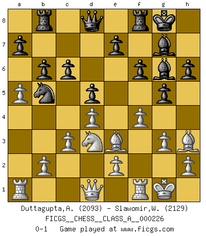 Last move : 0-1 2020 May 21 22:45:10 [Event "FICGS__CHESS__CLASS_A__000226"] [Site "FICGS"] [Date "2020.03.01"] [Round "1"] [White "Duttagupta,Aniruddha"] [Black "Slawomir,Weglicki"] [Result "0-1"] [WhiteElo "2093"] [BlackElo "2129"] 1.d4 Nf6 2.Nf3 g6 3.g3 d5 4.Bg2 c6 5.O-O Bg7 6.a4 O-O 7.a5 Na6 8.Bf4 Ne4 9.Nbd2 Bf5 10.c3 f6 11.Nxe4 Bxe4 12.Bh3 g5 13.Be3 Nc7 14.Nd2 Bg6 15.Nb3 b6 16.Nc1 h6 17.Nd3 Rb8 18.f4 Nb5 0-1 This chess game has been lost on time (started : 2020.03.01 18:36:53) King's Indian : Fianchetto without c4 Kingside Castling by player White (move 5) Kingside Castling by player Black (move 6) Player Black won this chess game. Follow this game move after move (download)Only sissies Castle. (Rob Sillars) Über Kasparov: Es ist offensichtlich, daß er in einem totalitären Staat aufwuchs und deshalb zu diktatorischen Zügen neigt. (Viktor Kortschnoi) Por tratar de evitar la pérdida de una pieza, muchas personas han perdido una partida de Ajedrez. (Savielly Tartakover) Horreur, mais aussi harmonie suprême : qu'y avait-il en effet au monde en dehors des échecs ? Le brouillard, l'inconnu, le non-être... (Vladimir Nabokov) War is the child of passion, passion is the child of narcissism and narcissism is the child. (...) Another game ? (Thibault de Vassal)