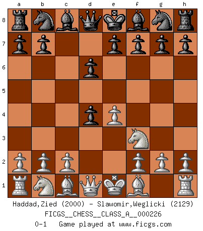 Last move : 0-1 2020 April 12 22:50:2 [Event "FICGS__CHESS__CLASS_A__000226"] [Site "FICGS"] [Date "2020.03.01"] [Round "1"] [White "Haddad,Zied"] [Black "Slawomir,Weglicki"] [Result "0-1"] [WhiteElo "2000"] [BlackElo "2129"] 1.e4 c5 2.Nf3 d6 3.d4 cxd4 0-1 This chess game has been lost on time (started : 2020.03.01 18:36:53) Sicilian Player Black won this chess game. Follow this game move after move (download)Chess is a part of culture and if a culture is declining then Chess too will decline. (Mikhail Botvinnik) Jeder Fehler erscheint unglaublich dumm, wenn andre ihn begehen. (Georg Christoph Lichtenberg) El Ajedrez es un regaderazo frío para la mente. (Sir John Simon) Tous ces prétendus hommes politiques sont les pions, les Cavaliers, les Tours ou les Fous d'une partie d'échecs qui se jouera tant qu'un hasard ne renversera pas l'échiquier. (Honoré de Balzac) Fortune favours the audacious. (Desiderius Erasmus)
