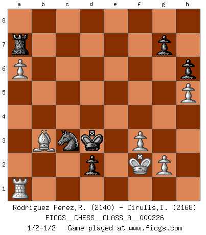 Last move : 1/2-1/2 2020 June 20 22:31:23 [Event "FICGS__CHESS__CLASS_A__000226"] [Site "FICGS"] [Date "2020.03.01"] [Round "1"] [White "Rodriguez Perez,Rene"] [Black "Cirulis,Ilmars"] [Result "1/2-1/2"] [WhiteElo "2140"] [BlackElo "2168"] 1.e4 e5 2.Nf3 Nc6 3.d4 exd4 4.Nxd4 Nf6 5.Nc3 Bb4 6.Nxc6 bxc6 7.Bd3 d5 8.exd5 cxd5 9.a3 Be7 10.O-O O-O 11.Re1 Be6 12.Qf3 c5 13.b3 Rc8 14.h3 h6 15.Bf4 Bd6 16.a4 Bxf4 17.Qxf4 Re8 18.Nb5 Re7 19.b4 c4 20.Bf1 Qb6 21.Qd4 Qb8 22.Qe5 Kf8 23.Qb2 Ne4 24.c3 a5 25.Nd4 axb4 26.Qxb4 Qxb4 27.cxb4 Ra7 28.Be2 Nc3 29.a5 Rb7 30.Nxe6+ fxe6 31.Bg4 Rxb4 32.Bxe6 Ra8 33.Re5 d4 34.Rc5 d3 35.Rxc4 Rxc4 36.Bxc4 d2 37.Bb3 Ke7 38.f3 Kd6 39.a6 Kc5 40.Kf2 Kd4 41.h4 Kd3 42.h5 Ra7 43.Ra3 Kd4 44.Ra1 Kd3 1/2-1/2 Scotch : Schmidt variation Kingside Castling by player White (move 10) Kingside Castling by player Black (move 10) This chess game ended in a draw. Follow this game move after move (download)We must make sure that Chess will not be like a dead language, very interesting, but for a very small group. (Sytze Faber) Kostenjuk hat keinen Sexappeal. (Loek van Wely) Hasta este punto, las blancas han seguido un análisis bien conocido. Pero ahora el hace un error fatal: empieza a usar su propia cabeza. (Siegbert Tarrasch) On peut tirer plus d'utilité d'une partie perdue que de 100 parties gagnées. (Capablanca) Mac users swear by their computers. PC users swear at their computers. (Author unknown)