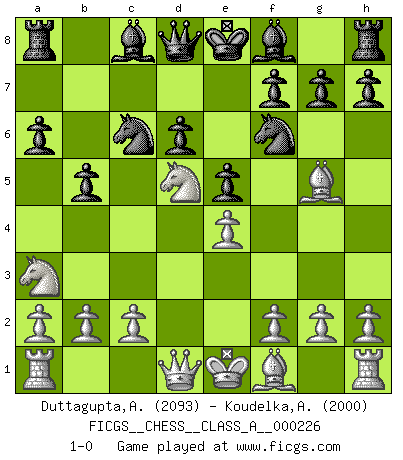 Last move : 1-0 2020 May 17 5:33:41 [Event "FICGS__CHESS__CLASS_A__000226"] [Site "FICGS"] [Date "2020.03.01"] [Round "1"] [White "Duttagupta,Aniruddha"] [Black "Koudelka,Artur"] [Result "1-0"] [WhiteElo "2093"] [BlackElo "2000"] 1.e4 c5 2.Nf3 Nc6 3.d4 cxd4 4.Nxd4 Nf6 5.Nc3 e5 6.Ndb5 d6 7.Bg5 a6 8.Na3 b5 9.Nd5 1-0 This chess game has been lost on time (started : 2020.03.01 18:36:53) Sicilian : Pelikan (Lasker/Sveshnikov) variation Player White won this chess game. Follow this game move after move (download)We cannot resist the fascination of sacrifice, since a passion for sacrifices is part of a Chessplayer's nature. (Rudolf Spielman) Im Blitz ist es einfacher mit einer Figur weniger anzugreifen, als sich mit einer Mehrfigur zu verteidigen. (Mikhail Nekhemyevich Tal) La caracteristica mas importante en la posición del Ajedrez es la actividad de las piezas. Esto es absolutamente fundamental en todas las fases del juego: Apertura, Juego Medio y especialmente Finales. La limitación primordial en la actividad de una pieza, es la estructuración de los Peones. (Michael Stean) Le pion, dans sa simplicité, marche droit devant lui, mais lorsqu'il prend, il le fait obliquement? Ainsi l'homme, tant qu'il reste pauvre, marche dans la droiture et vit honnêtement, mais lorsqu'il recherche les honneurs, il flatte, se parjure et, par les voies obliques, cherche une position supérieure sur l'échiquier du monde. (Jean de Galles) Don't be discouraged. It's often the last key in the bunch that opens the lock. (Author unknown)