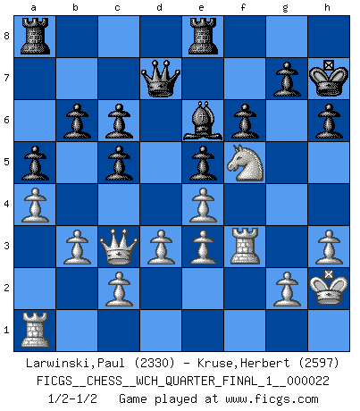 Last move : 1/2-1/2 2020 March 24 15:41:8 [Event "FICGS__CHESS__WCH_QUARTER_FINAL_1__000022"] [Site "FICGS"] [Date "2020.03.01"] [Round "6"] [White "Larwinski,Paul"] [Black "Kruse,Herbert"] [Result "1/2-1/2"] [WhiteElo "2330"] [BlackElo "2597"] 1.e4 e5 2.Nf3 Nc6 3.Bb5 Nf6 4.d3 Bc5 5.Bxc6 dxc6 6.Nbd2 O-O 7.Nc4 Re8 8.Be3 Bxe3 9.Nxe3 b6 10.Qd2 c5 11.Qc3 Qe7 12.a4 Ng4 13.Nd5 Qd6 14.h3 c6 15.Ne3 Nxe3 16.fxe3 f6 17.O-O Be6 18.b3 h6 19.Nh4 a5 20.Nf5 Qd7 21.Kh2 Kh7 22.Rf3 1/2-1/2 Ruy Lopez : Berlin defense Kingside Castling by player Black (move 6) Kingside Castling by player White (move 17) This chess game ended in a draw. Follow this game move after move (download)In Chess, as it is played by masters, chance is practically eliminated. (Emanuel Lasker) Privat ist Kortschnoi kein schlechter Mensch, sehr sympathisch. Aber während des Spiels ist er grausam. Er will dich töten. (Miguel Najdorf) Las piezas de Ajedrez son los bloques del alfabeto que moldean los pensamientos; y esos pensamientos, aunque hagan un diseño visual en el tablero, expresan abstractamente su belleza como un poema. (Marcel Duchamp) Aux échecs, l'amour-propre est satisfait quand on remporte la victoire, mais il n'y a pas de honte à être battu. (Benjamin Franklin) Animated gif is worth one mega-word. (Unknown)
