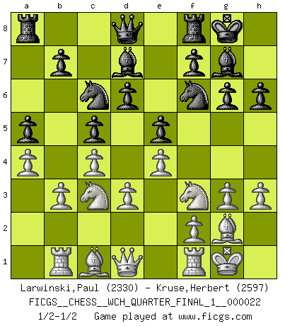 Last move : 1/2-1/2 2020 March 17 19:43:38 [Event "FICGS__CHESS__WCH_QUARTER_FINAL_1__000022"] [Site "FICGS"] [Date "2020.03.01"] [Round "8"] [White "Larwinski,Paul"] [Black "Kruse,Herbert"] [Result "1/2-1/2"] [WhiteElo "2330"] [BlackElo "2597"] 1.Nf3 Nf6 2.g3 c5 3.Bg2 Nc6 4.O-O e5 5.e4 d6 6.d3 g6 7.c4 Bg7 8.Nc3 O-O 9.a3 a5 10.Rb1 Bd7 11.b3 Nd4 12.h3 h6 13.a4 Nc6 1/2-1/2 Reti Opening Kingside Castling by player White (move 4) Kingside Castling by player Black (move 8) This chess game ended in a draw. Follow this game move after move (download)The passed pawn is a criminal, who should be kept under lock and key. Mild measures, such as police surveillance, are not sufficient. (Nimzovitch) Ich verachte Kasparow. (Viktor Kortschnoi) Con o sin el título, Bobby Fischer fue sin lugar a dudas el mas grande jugador de su época. (Burt Hochberg) Les ravages du H expliquent la différence de niveau entre Tal et Thal [Abergel]. The message for business people contemplating their place in the cyberspace is simple and direct: get linked or get lost. (Vic Sussman and Kenan Pollack)