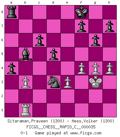 Last move : 0-1 2007 July 15 19:12:47 [Event "FICGS__CHESS__RAPID_C__000035"] [Site "FICGS"] [Date "2007.07.10"] [Round "1"] [White "Sitaraman,Praveen"] [Black "Hess,Volker"] [Result "0-1"] [WhiteElo "1300"] [BlackElo "1300"] 1.d4 d6 2.d5 Nf6 3.c4 g6 4.Nc3 Bg7 5.b4 O-O 6.b5 e6 7.h3 exd5 8.Rb1 dxc4 9.e3 d5 10.Nf3 c6 11.Ne5 Bf5 12.Bd3 cxd3 13.Nxd3 Ne4 14.Nxe4 Bxe4 15.O-O Qg5 16.g3 Qf5 17.Qg4 Bxd3 18.Qxf5 Bxf5 19.Rb3 Nd7 20.bxc6 bxc6 21.Ba3 Rfb8 22.g4 Rxb3 23.axb3 Bd3 24.Rc1 Bb5 25.Kg2 Ne5 26.f4 Nd3 27.Rb1 Bf8 28.Bxf8 Kxf8 29.Kg3 a5 30.h4 a4 0-1 Queen's Pawn Kingside Castling by player Black (move 5) Kingside Castling by player White (move 15) Player Black won this chess game. Follow this game move after move (download)Fischer Chess play was always razor-sharp, rational and brilliant. One of the best ever. (Dave Regis) Wenn du gegen Bobby spielst, ist es keine Frage von gewinnen oder verlieren. Es ist eine Frage des Überlebens. (Boris Vassilievich Spassky) Cuando le juegas a Fischer, no es una cuestion de si vas a ganar o perder. Es una cuestion de si vas a sobrevivir. (Boris Spassky) Tous ces prétendus hommes politiques sont les pions, les Cavaliers, les Tours ou les Fous d'une partie d'échecs qui se jouera tant qu'un hasard ne renversera pas l'échiquier. (Honoré de Balzac) Man is reluctant to give credit for intelligence to anyone, except his enemies. (Albert Einstein)
