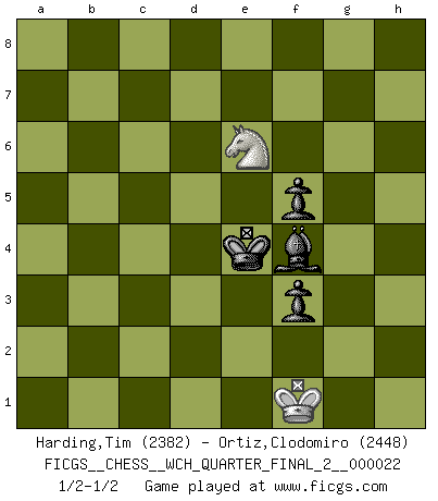 Last move : 1/2-1/2 2020 May 30 14:45:54 [Event "FICGS__CHESS__WCH_QUARTER_FINAL_2__000022"] [Site "FICGS"] [Date "2020.03.01"] [Round "6"] [White "Harding,Tim"] [Black "Ortiz,Clodomiro"] [Result "1/2-1/2"] [WhiteElo "2382"] [BlackElo "2448"] 1.c4 e6 2.Nf3 Nf6 3.Nc3 d5 4.d4 c6 5.cxd5 exd5 6.Qc2 g6 7.Bg5 Bg7 8.Bxf6 Bxf6 9.e3 O-O 10.h4 h5 11.Bd3 a5 12.Ne2 Na6 13.a3 Qe7 14.Nf4 Bg4 15.Qd2 a4 16.Kf1 Nc7 17.Nh2 Bd7 18.g3 c5 19.Kg2 c4 20.Be2 Kg7 21.Bf3 Qd6 22.Rhc1 b5 23.Kg1 Rfb8 24.Bg2 Ra6 25.Nf3 b4 26.axb4 Qxb4 27.Ra2 Rab6 28.Rd1 Qxd2 29.Rxd2 Rb3 30.Kh2 Bf5 31.Ne1 Bd8 32.Re2 Bg4 33.Bf3 Be7 34.Bxg4 hxg4 35.e4 Nb5 36.Rxa4 c3 37.Re3 Rxb2 38.Nxd5 Bd8 39.Nxc3 Rxf2+ 40.Kg1 Nxc3 41.Rxc3 Re2 42.Kf1 Rxe4 43.Nc2 Rb1+ 44.Kf2 Rc1 45.Ra1 Rxa1 46.Nxa1 Rxd4 47.Nc2 Bb6 48.Ke2 Re4+ 49.Kf1 Re5 50.Rb3 Rf5+ 51.Ke2 Bc5 52.Rc3 Bg1 53.Ra3 Rf2+ 54.Kd1 Kh6 55.Ne3 f5 56.Nd5 Rf3 57.Rxf3 gxf3 58.Ke1 Bc5 59.Nf6 g5 60.hxg5+ Kxg5 61.Nd5 Kg4 62.Kf1 Kxg3 63.Nc3 Kf4 64.Nd5+ Ke4 65.Nf6+ Ke3 66.Nd5+ Kd4 67.Nc7 Ke5 68.Nb5 Ke4 69.Nc7 Bd4 70.Ne6 Be3 71.Nc7 Bd4 72.Ne6 Be3 73.Nc7 Bf4 74.Ne6 Bg3 75.Ng5+ Ke3 76.Ne6 Bf4 77.Ng7 Ke4 78.Ne6 Ke5 79.Nc7 Ke4 80.Ne6 1/2-1/2 English Opening Kingside Castling by player Black (move 9) 10 pieces endgame at move 57 : White KRNPP , Black KBPPP WHITE : King + 1 Rook 1 Knight 2 Pawns BLACK : King + 1 Bishop 3 Pawns 9 pieces endgame at move 57 : White KNPP , Black KBPPP WHITE : King + 1 Knight 2 Pawns BLACK : King + 1 Bishop 3 Pawns 8 pieces endgame at move 60 : White KNPP , Black KBPP WHITE : King + 1 Knight 2 Pawns BLACK : King + 1 Bishop 2 Pawns 7 pieces endgame at move 60 : White KNP , Black KBPP WHITE : King + 1 Knight 1 Pawn BLACK : King + 1 Bishop 2 Pawns 6 pieces endgame at move 62 : White KN , Black KBPP WHITE : King + 1 Knight BLACK : King + 1 Bishop 2 Pawns This chess game ended in a draw. Follow this game move after move (download)Chess is a terrific way for kids to build self image and self esteem. (Saudin Robovic) Ein Remis kann durch Wiederholung von drei Zügen oder durch einen schlechte Zug erreicht werden. (Savielly Grigorievitsch Tartakower) Yo tuve un dolor de muelas en la primer partida. En el segundo juego, tuve un dolor de cabeza. En el tercero, tuve un ataque de reumatísmo. En la cuarta partida, no me sentía muy bien. ¿Y en el quinto juego? Bueno, ¿que acaso uno tiene que ganar todos los juegos?. (Siegbert Tarrasch) Les échecs c'est le défi de l'alpiniste, toujours plus haut, prêt à tout pour monter à l'assaut du Roi ennemi. Les échecs, c'est de la musique en mouvement, un ballet majestueux pour les yeux. C'est de la poésie composée par les fantômes du passé qui au même titre que Rimbaud ou Verlaine méritent notre admiration. Les échecs, c'est de la peinture ou le moindre mouvement modifie le tableau pour en faire un Picasso ou un Van Gogh. Les échecs, c'est tout et rien, c'est la vie et la mort. Jjulie33 sur le forum de France-Echecs. Computers are like Old Testament gods; lots of rules and no mercy. (Joseph Campbell)