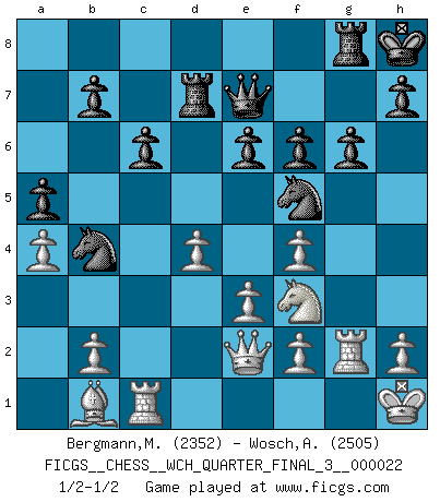 Last move : 1/2-1/2 2020 May 17 10:23:50 [Event "FICGS__CHESS__WCH_QUARTER_FINAL_3__000022"] [Site "FICGS"] [Date "2020.03.01"] [Round "4"] [White "Bergmann,Michael"] [Black "Wosch,Arkadiusz"] [Result "1/2-1/2"] [WhiteElo "2352"] [BlackElo "2505"] 1.Nf3 Nf6 2.g3 d5 3.Bg2 e6 4.O-O Be7 5.c4 O-O 6.d4 dxc4 7.Qc2 a6 8.a4 Bd7 9.Qxc4 Bc6 10.Bf4 Bd6 11.Nc3 Bxf4 12.gxf4 a5 13.Rac1 Bxf3 14.Bxf3 c6 15.Nb1 Ne8 16.e3 Nd6 17.Qe2 Na6 18.Nd2 g6 19.Rfd1 Nb4 20.Kh1 Nf5 21.Be4 Rc8 22.Kg1 Kh8 23.Bb1 Rg8 24.Kh1 f6 25.Nf3 Rc7 26.Rg1 Rd7 27.Rg2 Qe7 1/2-1/2 Reti Opening Kingside Castling by player White (move 4) Kingside Castling by player Black (move 5) This chess game ended in a draw. Follow this game move after move (download)When you play Bobby, it is not a question if you win or lose. It is a question if you survive. (Boris Spassky) Der Vorposten provoziert a) eine Basis für neue Angriffe und b) eine Schwächung der gegnerischen Widerstandskraft in der fraglichen Linie. (Aaron Nimzowitsch) Es el objetivo de la escuela moderna no tratar cada posición de acuerdo a una regla general, sino de acuerdo al principio inherente en la posición. (Richard Reti) Je ne crois pas en la psychologie, je crois aux bons coups. (Robert Fischer) I'll be back. (Arnold Schwarzenegger)