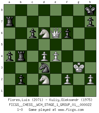 Last move : 1-0 2020 March 29 19:3:36 [Event "FICGS__CHESS__WCH_STAGE_1_GROUP_01__000022"] [Site "FICGS"] [Date "2020.03.01"] [Round "1"] [White "Flores,Luis"] [Black "Kuliy,Oleksandr"] [Result "1-0"] [WhiteElo "2071"] [BlackElo "1975"] 1.d4 d5 2.Nf3 Nf6 3.c4 e6 4.g3 Be7 5.Bg2 O-O 6.O-O dxc4 7.Qc2 a6 8.a4 Bd7 9.Qxc4 Bc6 10.Bf4 Bd6 11.Nc3 Bxf4 12.gxf4 a5 13.e3 Na6 14.Rac1 Nb4 15.Ne5 Bxg2 16.Kxg2 c6 17.Qe2 Nfd5 18.Rg1 f6 19.Nc4 Kh8 20.Kh1 Qc7 21.Ne4 b6 22.Qh5 Rab8 23.Rg3 b5 24.Ncd6 bxa4 25.Rcg1 Nd3 26.Rxg7 Qxg7 27.Rxg7 Kxg7 28.Qe2 a3 29.Qxd3 axb2 30.Nd2 a4 31.N6c4 Rb4 32.Qc2 Ra8 33.Na3 Ra6 34.Kg2 Rab6 35.Qc5 Kf7 36.Nac4 Ra6 37.e4 Nxf4+ 38.Kg3 Nd3 39.Qh5+ Kg7 40.Nd6 Ra7 41.Qg4+ Kh8 42.Qxe6 1-0 Queen's pawn game Kingside Castling by player Black (move 5) Kingside Castling by player White (move 6) Player White won this chess game. Follow this game move after move (download)I like to say that Bobby Fischer was the greatest player ever. But what made Fischer a genius was his ability to blend an American freshness and pragmatism with Russian ideas about strategy. (Bruce Pandolfini) Das typische an einem Großmeister ist, daß er eine gewonnene Position schnell und schmerzlos gewinnt. (Irving Chernev) Durante una competencia de Ajedrez, un Maestro de Ajedrez deberá ser una combinación de presa de caza y un Monge. (Alexander Alekhine) Des idées, des idées, j'en ai cent, j'en ai mille. Des bonnes, des mauvaises, applicables, irréalisables... Il suffit de faire le tri ! (Roos) Life is pain my dear and anyone who says otherwise is selling something. (Princess Bride)