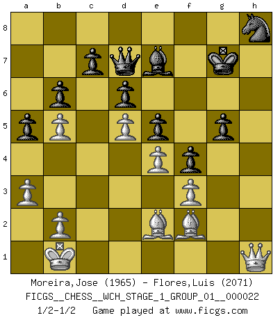 Last move : 1/2-1/2 2020 April 14 18:19:17 [Event "FICGS__CHESS__WCH_STAGE_1_GROUP_01__000022"] [Site "FICGS"] [Date "2020.03.01"] [Round "1"] [White "Moreira,Jose"] [Black "Flores,Luis"] [Result "1/2-1/2"] [WhiteElo "1965"] [BlackElo "2071"] 1.d4 Nf6 2.c4 g6 3.Nc3 Bg7 4.e4 d6 5.Nge2 O-O 6.Ng3 e5 7.d5 h5 8.Bg5 Qe8 9.Be2 a5 10.Nf1 Nh7 11.Be3 Na6 12.f3 f5 13.a3 Nf6 14.Nd2 b6 15.h3 Bd7 16.g4 f4 17.Bf2 g5 18.Nb5 Qd8 19.gxh5 Kf7 20.h6 Bxh6 21.Qc2 Bg7 22.O-O-O Rh8 23.Rdg1 Ng8 24.Bf1 Bf6 25.Nb1 Nc5 26.N1c3 Ne7 27.Kb1 Ng6 28.Na4 Nh4 29.Be2 Be7 30.Bd1 Nxa4 31.Qxa4 Ng6 32.Be2 Bxh3 33.Qd1 Kg7 34.Rh2 Bd7 35.Rgh1 Rxh2 36.Rxh2 Bxb5 37.cxb5 Qd7 38.Qh1 Rh8 39.Rxh8 Nxh8 1/2-1/2 King's Indian : Kramer system Kingside Castling by player Black (move 5) Queenside Castling by player White (move 22) This chess game ended in a draw. Follow this game move after move (download)It is not enough to be a good player... you must also play well. (Siegbert Tarrasch) Es ist wirklich schade, dass so viele Schachspieler nicht auf ihr Äußeres achten! (Alexandra Kosteniuk) Ser exitoso en el Ajedrez te permite descubrir tu propia personalidad. Eso es lo que deseo para los niños de mi clase. (Saudin Robovic) Ce qui est bien, c'est d'avoir tout un tas de pièces en prise : l'adversaire ne peut en prendre qu'une à la fois. Cité par Thierry Audin. If you have any trouble condescending, find a Unix user to show you how it's done. (Scott Adams)