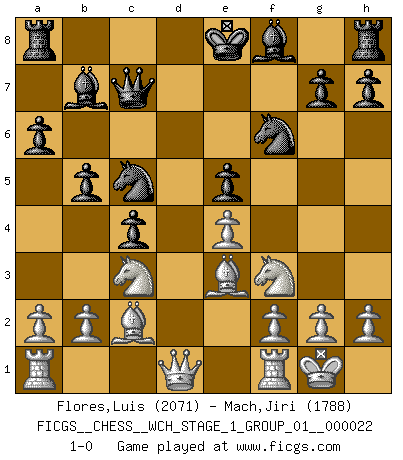 Last move : 1-0 2020 June 11 18:10:12 [Event "FICGS__CHESS__WCH_STAGE_1_GROUP_01__000022"] [Site "FICGS"] [Date "2020.03.01"] [Round "1"] [White "Flores,Luis"] [Black "Mach,Jiri"] [Result "1-0"] [WhiteElo "2071"] [BlackElo "1788"] 1.d4 Nf6 2.c4 e6 3.Nf3 d5 4.Nc3 c6 5.e3 Nbd7 6.Bd3 dxc4 7.Bxc4 b5 8.Bd3 Bb7 9.O-O a6 10.e4 c5 11.d5 Qc7 12.dxe6 fxe6 13.Bc2 c4 14.Nd4 Nc5 15.Be3 e5 16.Nf3 1-0 Queen's pawn game Kingside Castling by player White (move 9) Player White won this chess game. Follow this game move after move (download)Chess is war over the board. The object is to crush the opponents mind. (Bobby Fischer) Ich verstehe Aljechins Kombinationen ganz gut; aber woher er diese Angriffschancen bekommt und wie er die Eröffnung behandelt das ist für mich ein Buch mit sieben Siegeln. (Rudolf Spielmann) No hay otro maestro que tenga una voluntad terrífica de ganar. Al tablero, el irradía peligro y aún los oponentes mas fuertes tienden a congelarse como liebres cuando olfatean a una pantera. Aún sus debilidades son peligrosas. Con las blancas, su juego de apertura es predecible - te es posible hacer planes en su contra - pero es tan fuerte que tus planes casi nunca funcionan. En el juego medio, su precisión e invención son fabulosas y en finales, tú simplemente no le puedes vencer. (Experto Alemán anónimo) À la honte des hommes, on sait que les lois du jeu sont les seules qui soient partout justes, claires, inviolables et exécutées. Pourquoi l'Indien qui a donné les règles du jeu d'échecs est-il obéi de bon gré dans toute la terre, et que les décrétales des papes, par exemple, sont aujourd'hui un objet d'horreur et de mépris ? C'est que l'inventeur des échecs combina tout avec justesse pour la satisfaction des joueurs, et que les papes, dans leurs décrétales, n'eurent en vue que leur seul avantage. L'Indien voulut exercer également l'esprit des hommes et leur donner du plaisir; les papes ont voulu abrutir l'esprit des hommes. Voltaire (Dictionnaire philosophique / Garnier 1967) You think that education is too expensive ? Try ignorance. (Derek Bok)