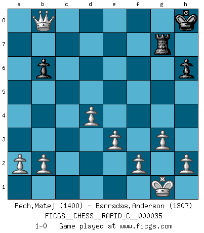 Last move : 1-0 2007 November 11 17:17:46 [Event "FICGS__CHESS__RAPID_C__000035"] [Site "FICGS"] [Date "2007.07.10"] [Round "1"] [White "Pech,Matej"] [Black "Barradas,Anderson"] [Result "1-0"] [WhiteElo "1400"] [BlackElo "1307"] 1.d4 Nf6 2.c4 e6 3.g3 Bb4+ 4.Bd2 Bxd2+ 5.Qxd2 O-O 6.Bg2 d5 7.Nf3 Nc6 8.O-O dxc4 9.Rc1 Ne4 10.Qf4 Nd6 11.Nbd2 Na5 12.Ne5 Nf5 13.e3 Rb8 14.Nexc4 Nxc4 15.Rxc4 Nd6 16.Rc2 b6 17.Rac1 Ne8 18.Nf3 Ba6 19.Ne5 Bb5 20.Bc6 Bxc6 21.Nxc6 Qd5 22.Ne7+ Kh8 23.Nxd5 exd5 24.Rxc7 Nxc7 25.Rxc7 f6 26.Rxa7 h6 27.Qc7 Rg8 28.Qd7 Rbd8 29.Qc6 Kh7 30.Qxf6 Rb8 31.Qf5+ Kh8 32.Qxd5 Rgd8 33.Qe5 Rg8 34.Rxg7 Rxg7 35.Qxb8+ 1-0 Catalan Opening Kingside Castling by player Black (move 5) Kingside Castling by player White (move 8) Player White won this chess game. Follow this game move after move (download)A thorough understanding of the typical mating continuations makes the most complicated sacrificial combinations leading up to them not only not difficult, but almost a matter of course. (Siegbert Tarrasch) Gewinnen beim Schach fördert das Selbstvertrauen. Beim Sex spüre ich sowas nicht... (Garry Kasparov) Solo puedes ser bueno en el Ajedrez si amas al juego. (Bobby Fischer) On peut tirer plus d'utilité d'une partie perdue que de 100 parties gagnées. (Capablanca) Humor is by far the most significant activity of the human brain. (Edward De Bono)