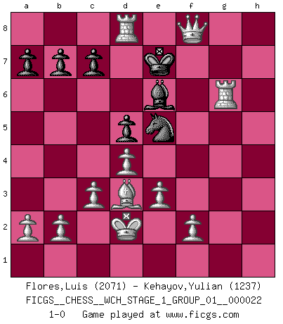 Last move : 1-0 2020 March 22 15:55:42 [Event "FICGS__CHESS__WCH_STAGE_1_GROUP_01__000022"] [Site "FICGS"] [Date "2020.03.01"] [Round "1"] [White "Flores,Luis"] [Black "Kehayov,Yulian"] [Result "1-0"] [WhiteElo "2071"] [BlackElo "1237"] 1.d4 d5 2.Nf3 Nc6 3.Bf4 e6 4.e3 Be7 5.Nbd2 Nf6 6.c3 Bd7 7.h3 O-O 8.Bd3 h6 9.g4 Nh7 10.h4 g5 11.hxg5 Nxg5 12.Rxh6 Nxf3+ 13.Nxf3 f5 14.gxf5 exf5 15.Kd2 Rf7 16.Qh1 Bf6 17.Rg1+ Kf8 18.Ng5 Bxg5 19.Rh8+ Ke7 20.Bxg5+ Rf6 21.Bxf6+ Kd6 22.Qh2+ f4 23.Qxf4+ Ne5 24.Bxd8 Rxd8 25.Rg6+ Be6 26.Rxd8+ Ke7 27.Qf8+ 1-0 Queen's pawn game, Chigorin variation Kingside Castling by player Black (move 7) Player White won this chess game. Follow this game move after move (download)You may learn much more from a game you lose than from a game you win. You will have to lose hundreds of games before becoming a good player. (Jose Raul Capablanca) Wenn du gegen Bobby spielst, ist es keine Frage von gewinnen oder verlieren. Es ist eine Frage des Überlebens. (Boris Vassilievich Spassky) Los libros de Ajedrez deben de usarse igual como usamos los anteojos: para mejorar la vista, aunque algunos jugadores los quieren usar como si ellos les otorgaran la vision. (José Raúl Capablanca) Toutes choses étant égales, c'est la conviction qui gagne. Alliée à une volonté de vaincre, elle sert de détonateur, suscite des idées, disperse les doutes et aide à penser clairement. (Robert Fischer) Information on the Internet is subject to the same rules and regulations as conversation at a bar. (George Lundberg)