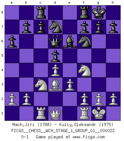 Last move : 0-1 2020 May 17 5:53:33 [Event "FICGS__CHESS__WCH_STAGE_1_GROUP_01__000022"] [Site "FICGS"] [Date "2020.03.01"] [Round "1"] [White "Mach,Jiri"] [Black "Kuliy,Oleksandr"] [Result "0-1"] [WhiteElo "1788"] [BlackElo "1975"] 1.c4 e6 2.Nc3 d5 3.d4 a6 4.cxd5 exd5 5.Bf4 Nf6 6.e3 Be6 7.Bd3 Bd6 8.Nge2 O-O 9.O-O Qe7 10.Bxd6 Qxd6 11.Rc1 Nbd7 12.Nf4 Rac8 0-1 English Opening Kingside Castling by player Black (move 8) Kingside Castling by player White (move 9) Player Black won this chess game. Follow this game move after move (download)Chess holds its master in its own bonds, shackling the mind and brain so that the inner freedom of the very strongest must suffer. (Albert Einstein) Wie kann ich Remis annehmen? Ich weiß ja gar nicht, wie ich stehe! (Fritz Sämisch) Debemos de asegurarnos de que el Ajedrez no se convierta en un lenguaje muerto, muy interesante, pero solo para un grupo muy pequeño. (Sytze Faber) Le joueur d'Echecs qui veut atteindre le top est obligé de développer son propre credo créatif. Alexeï Stepanovicth Souétine. Il est facile d'écrire des livres ! Ce qui est difficile, c'est de jouer ! (Alexeï Stepanovicth Souétine) Knowledge will give you power, but character respect. (Bruce Lee)