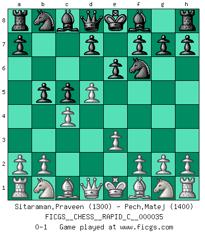 Last move : 0-1 2007 August 17 22:21:0 [Event "FICGS__CHESS__RAPID_C__000035"] [Site "FICGS"] [Date "2007.07.10"] [Round "1"] [White "Sitaraman,Praveen"] [Black "Pech,Matej"] [Result "0-1"] [WhiteElo "1300"] [BlackElo "1400"] 1.d4 Nf6 2.c4 c5 3.d5 b5 4.e3 e6 0-1 Benko gambit Player Black won this chess game. Follow this game move after move (download)It began to feel as though you were playing against Chess itself. - On playing against Robert Fischer. (Walter Shipman) Es tut gut, die Entwicklungsperiode von, [...] demokratischem Geist durchdringen zu lassen. Wie undemokratisch wäre es doch beispielsweise, den einen Offizier große Spaziertouren vornehmen zu lassen, während die anderen zu Hause säßen und sich entsetzlich langweilten. (Aaron Nimzowitsch) Aún el Rey más flojo huye despavorido ante la amenaza de un Jaque doble. (Aaron Nimzowitsch) Des idées, des idées, j'en ai cent, j'en ai mille. Des bonnes, des mauvaises, applicables, irréalisables... Il suffit de faire le tri ! (Roos) Empty your mind, be formless, shapeless — like water. (Bruce Lee)