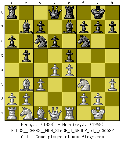 Last move : 0-1 2020 May 15 12:11:25 [Event "FICGS__CHESS__WCH_STAGE_1_GROUP_01__000022"] [Site "FICGS"] [Date "2020.03.01"] [Round "1"] [White "Pech,Jaroslav senior"] [Black "Moreira,Jose"] [Result "0-1"] [WhiteElo "1838"] [BlackElo "1965"] 1.e4 e5 2.Nf3 Nc6 3.Bb5 a6 4.Ba4 Nf6 5.O-O Be7 6.Re1 b5 7.Bb3 O-O 8.c3 d6 9.h3 Re8 10.d4 Bb7 0-1 This chess game has been lost on time (started : 2020.03.01 23:43:18) Ruy Lopez : Closed, 7...O-O Kingside Castling by player White (move 5) Kingside Castling by player Black (move 7) Player Black won this chess game. Follow this game move after move (download)A good sacrifice is one that is not necessarily sound but leaves your opponent dazed and confused. (Rudolph Spielmann) Jeder Fehler erscheint unglaublich dumm, wenn andre ihn begehen. (Georg Christoph Lichtenberg) Un mal día en el Ajedrez, es mejor que cualquier buen día en el trabajo. (Anonymous) L'attaque fait le spectacle, la défense gagne les matchs. (Dicton footballistique) Lottery : A tax on people who are bad at math. (Author unknown)